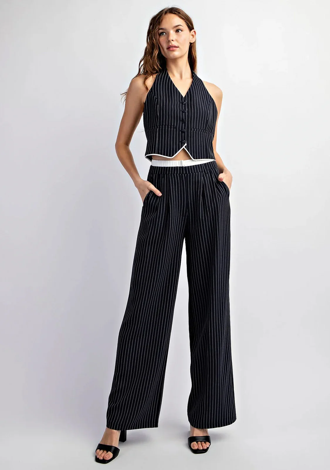 Ladies, these wide leg pinstripe trousers are a must-have for any fashion-forward woman. The contrasting waistband adds a stylish pop, while the vertical stripes create a lengthening effect that's oh-so-flattering. Dress them up with a sleek blouse and heels for the office, or keep it casual with a cute tee and sneakers for weekend brunch with the girls.