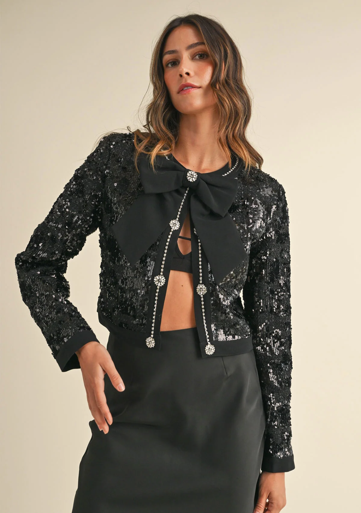 Hey there, fashion queen! Get ready to turn heads with our Sequin Tweed Bow Trim Front Crop Jacket - it's the ultimate statement piece your wardrobe has been craving.